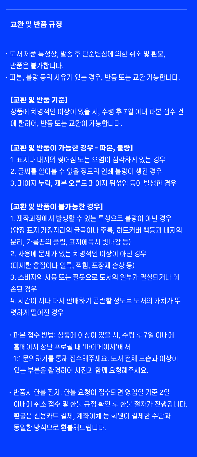 - 도서 제품의 특성상, 발송 후 단순변심에 의한 취소는 불가합니다.