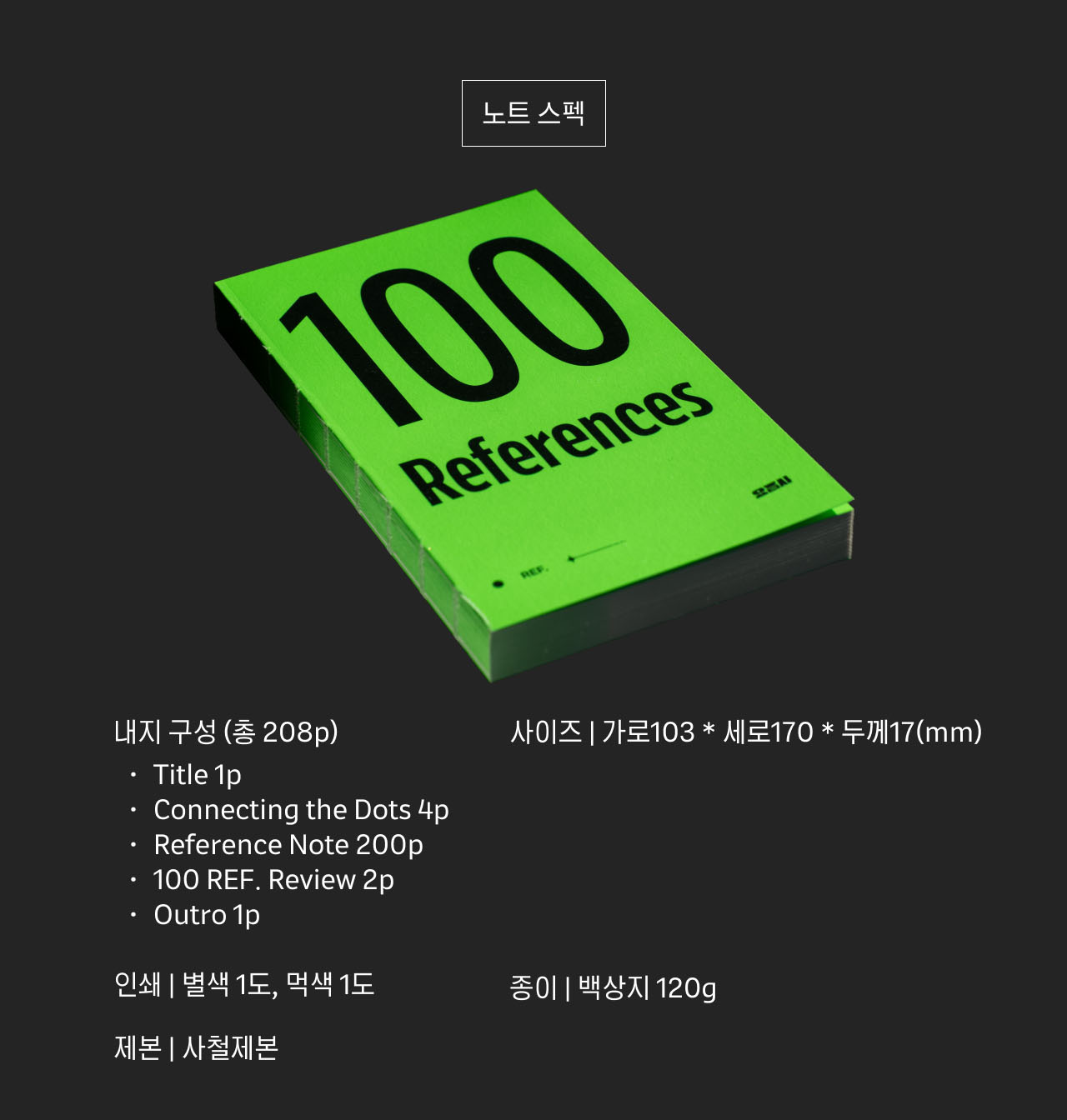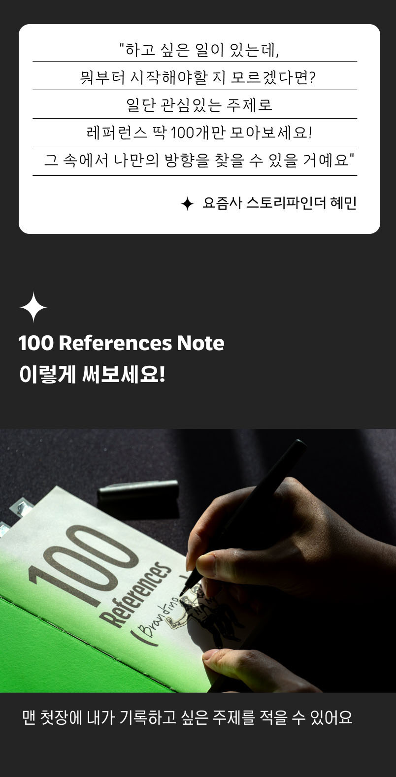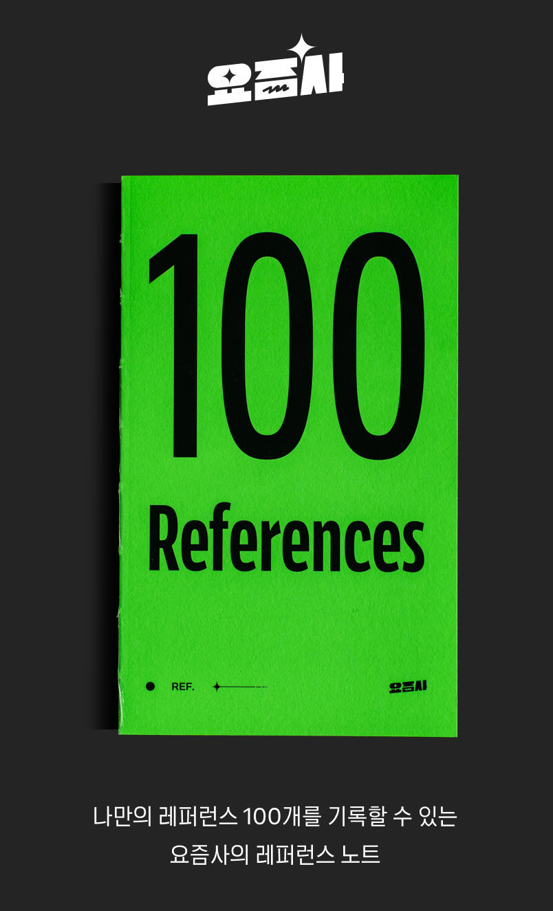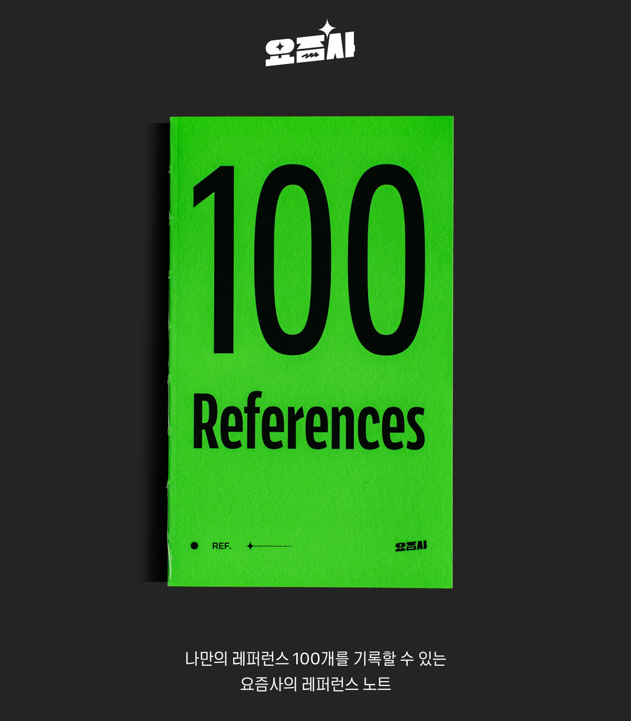 『100 References Note』는 나만의 레퍼런스 100개를 기록할 수 있는 요즘사의 레퍼런스 노트입니다.