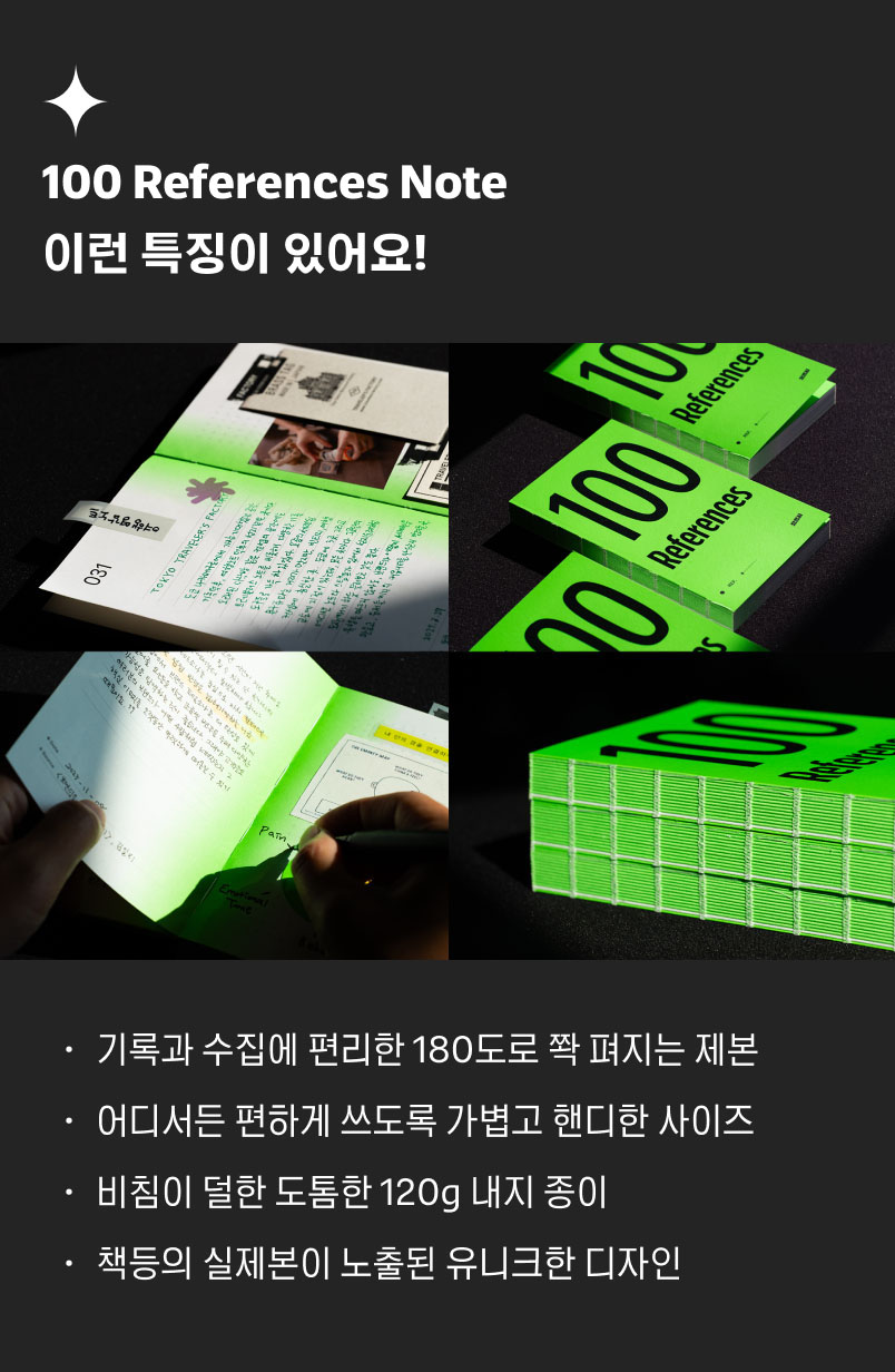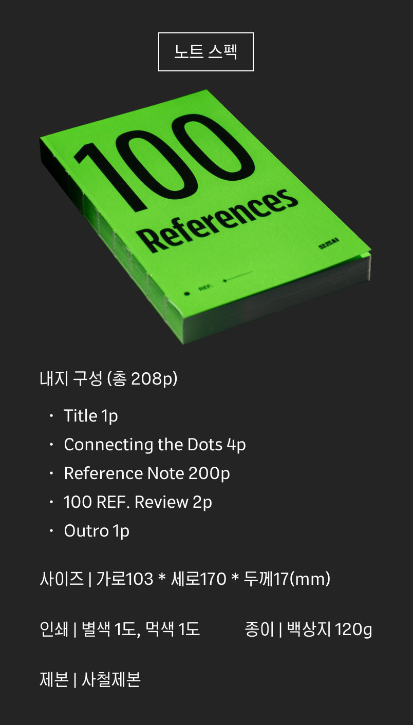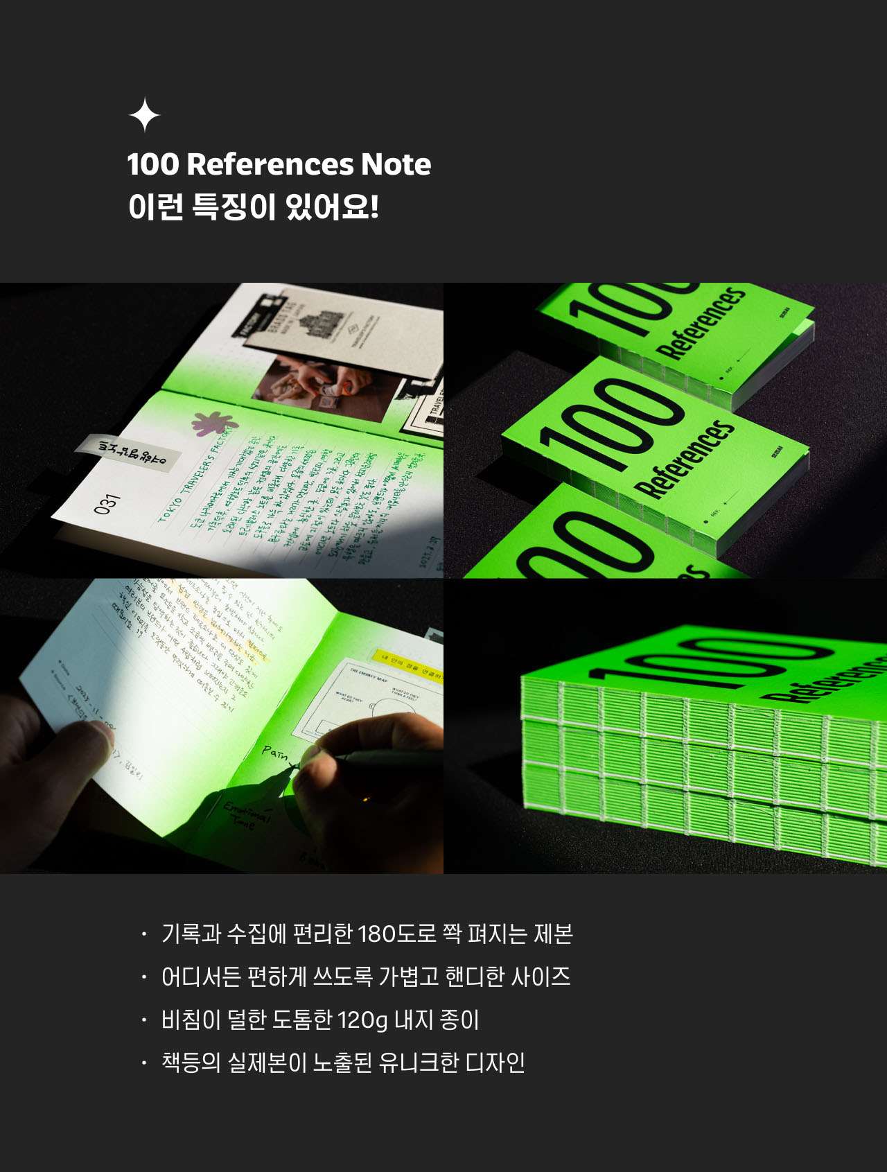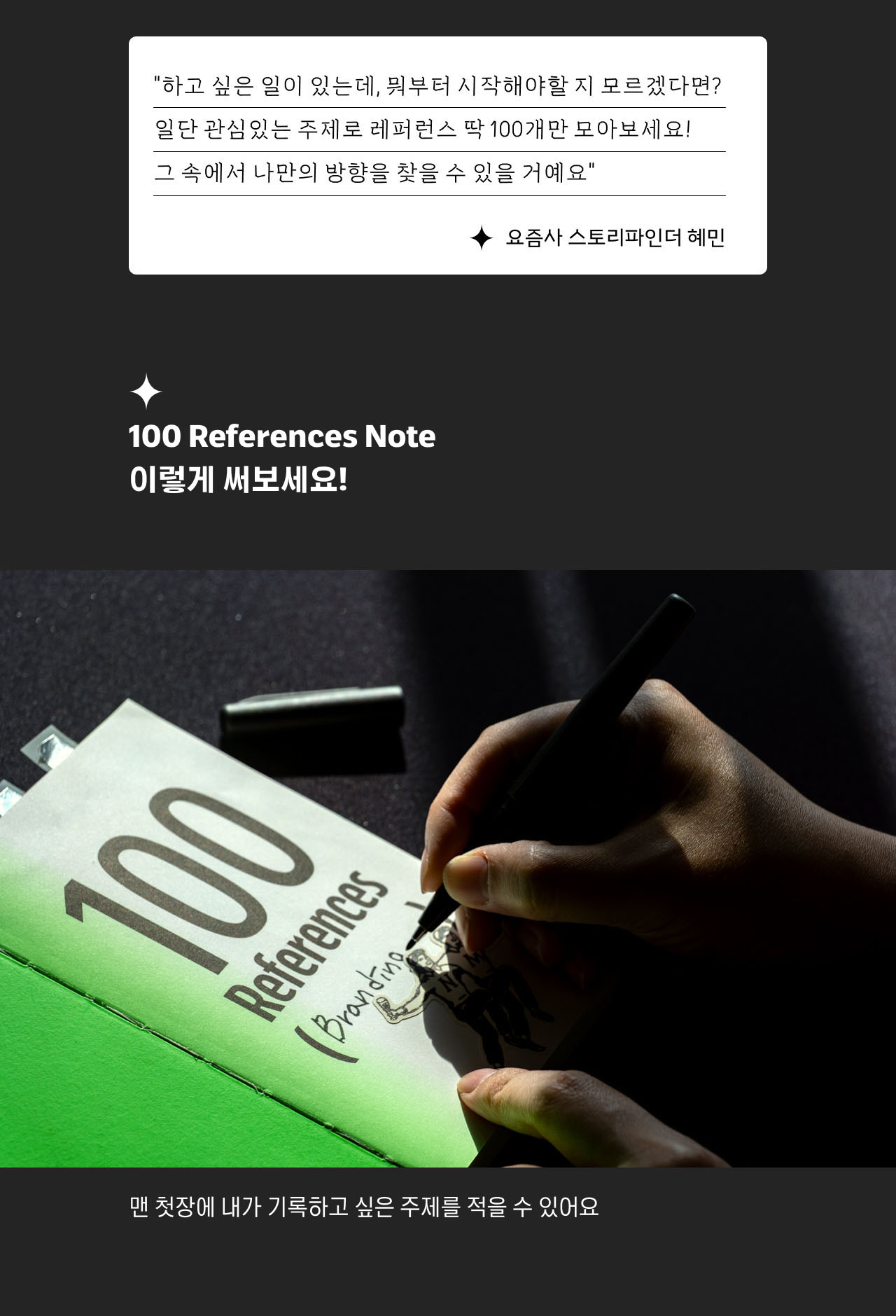 『100 References Note』는 나만의 레퍼런스 100개를 기록할 수 있는 요즘사의 레퍼런스 노트입니다.