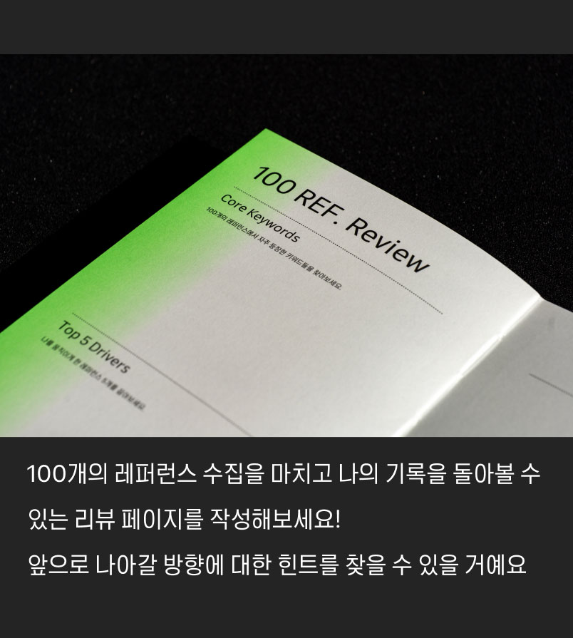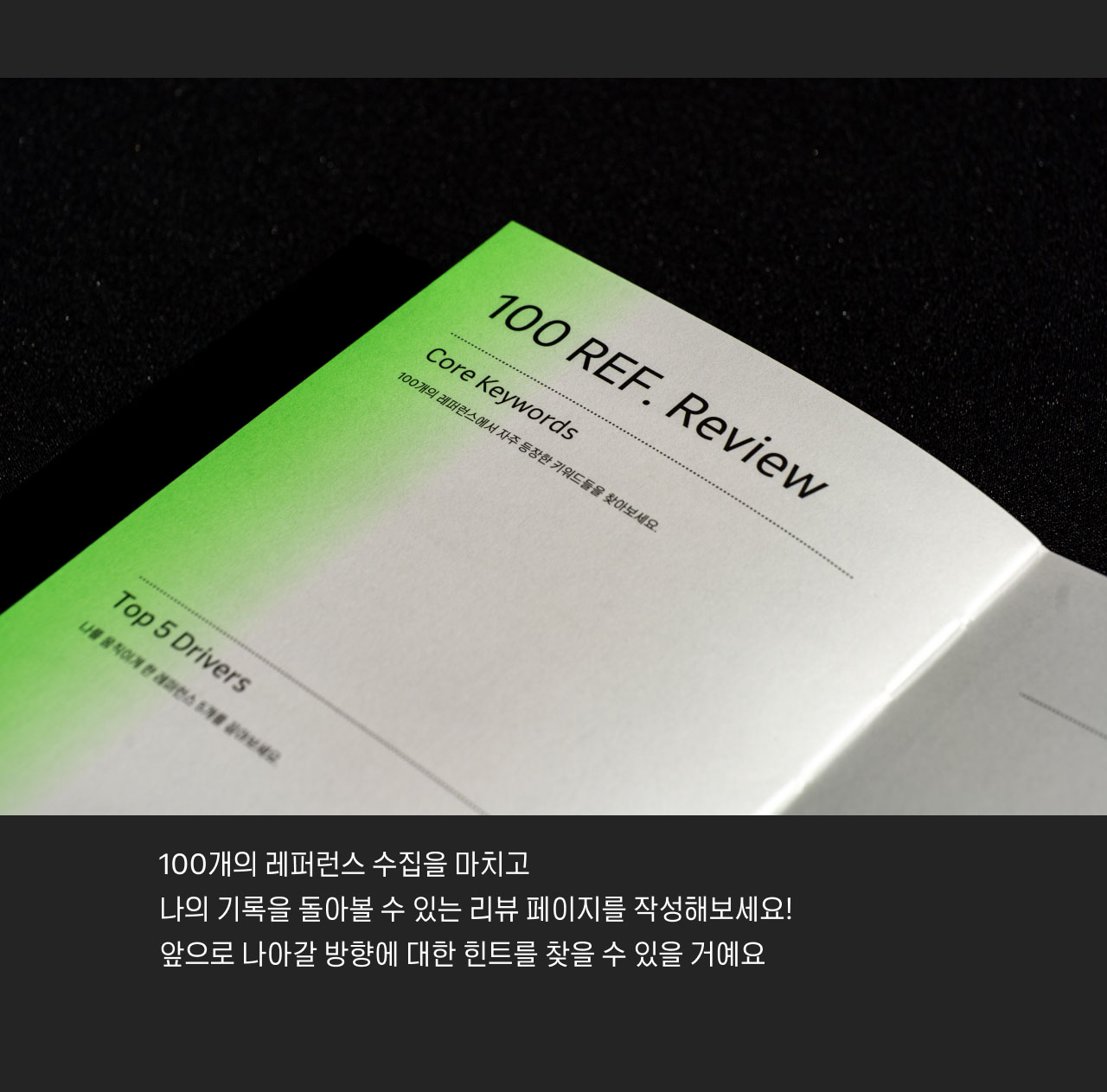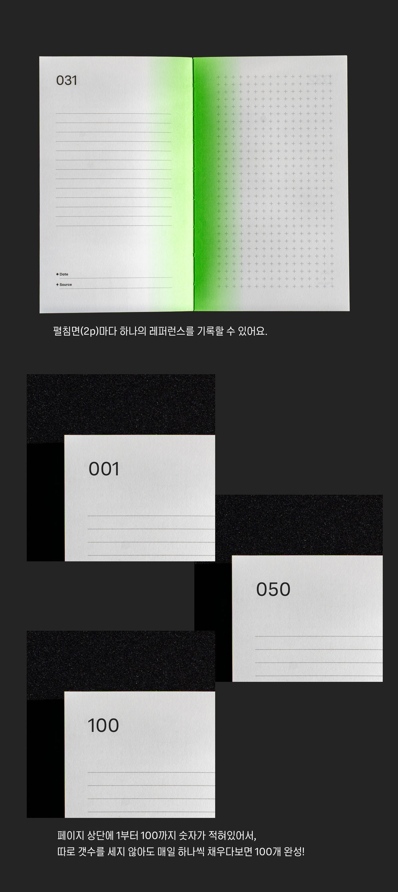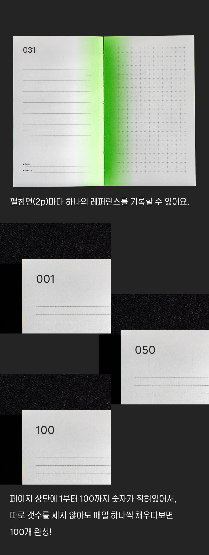 『100 References Note』는 나만의 레퍼런스 100개를 기록할 수 있는 요즘사의 레퍼런스 노트입니다.