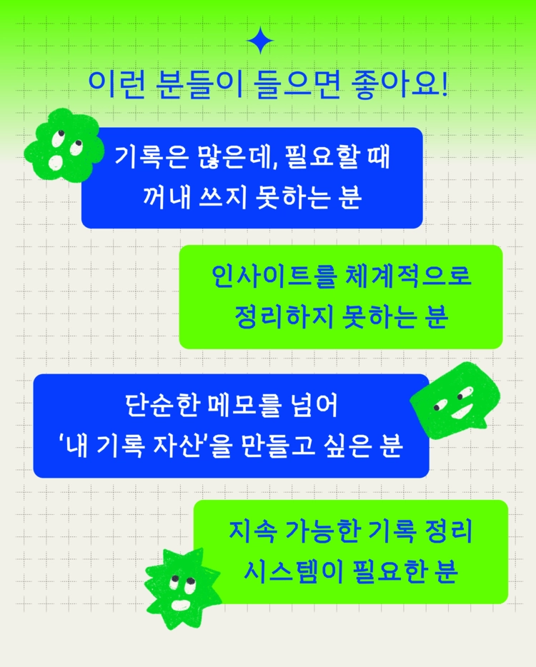 - 단순한 메모를 넘어 ‘나만의 기록자산’을 체계적으로 쌓고 싶은 분