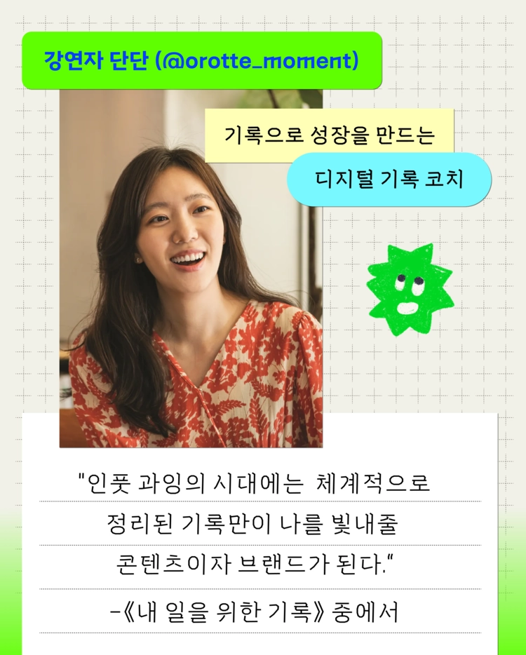안내하고 있어요. 책, 유튜브, 뉴스레터, 인스타그램, 블로그에 꾸준히 콘텐츠를 올리는 크리에이터이기도 합니다. 책 『내 일을 위한 기록』,