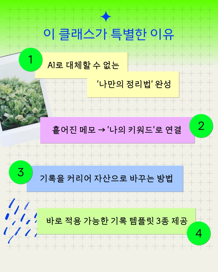 - 강연 직후 바로 실천 가능 : 기록 템플릿과 회고 가이드를 함께 제공해, 클래스가 끝난 그날부터 바로 적용할 수 있습니다.